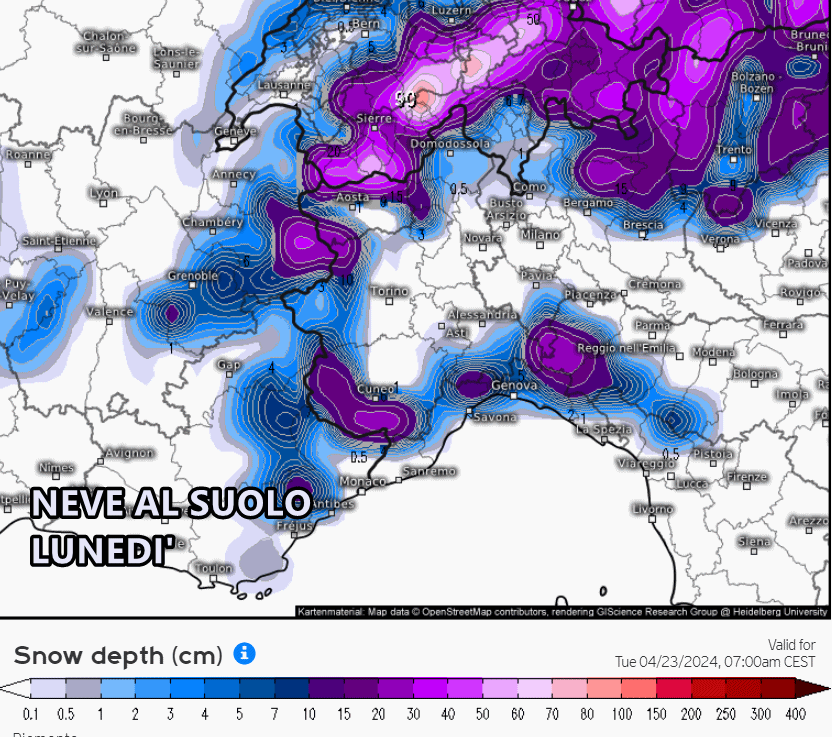 Il modello americano GFS propone un crollo della quota neve nelle prime ore di lunedì e durante le ore mattutine soprattutto tra Emilia occidentale, Oltrepò Pavese e Basso Piemonte al confine con l’Appennino Ligure. Su questi settori la neve (precisiamo: bagnata o mista a pioggia) potrebbe scendere per brevi momenti anche al di sotto dei 300m di quota, portandosi quindi a quote pianeggianti durante i fenomeni più intensi attesi proprio tra la notte e le ore mattutine di lunedì. Quota neve oltre i 400 m sul torinese e il Piemonte occidentale, ma non escludiamo anche su questi settori, soprattutto sulle pedemontane, l’arrivo di nevicate a quote lievemente più basse.