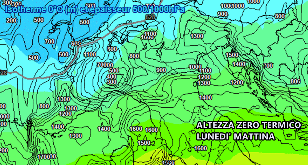 Nella mappa seguente possiamo notare il crollo dello zero termico tra basso Piemonte e Oltrepo pavese fino a 300 metri: