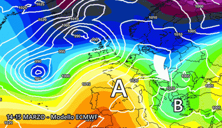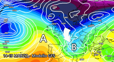 Il modello americano GFS, assieme al canadese GEM, mostra un’irruzione fredda diretta sull’Italia con ingresso occidentale, ovvero sul Tirreno: questa dinamica favorirebbe lo sviluppo di una bassa pressione tirrenica colma di maltempo per tante nostre regioni. Anche il nord rivedrebbe piogge e acquazzoni già col transito del fronte caldo della saccatura. Inoltre irromperebbe aria più fredda nord atlantica che farebbe scendere ovunque le temperature, a partire proprio dal settentrione tra 15 e 16 marzo. Le piogge, invece, si presenterebbero già dal 14 marzo.