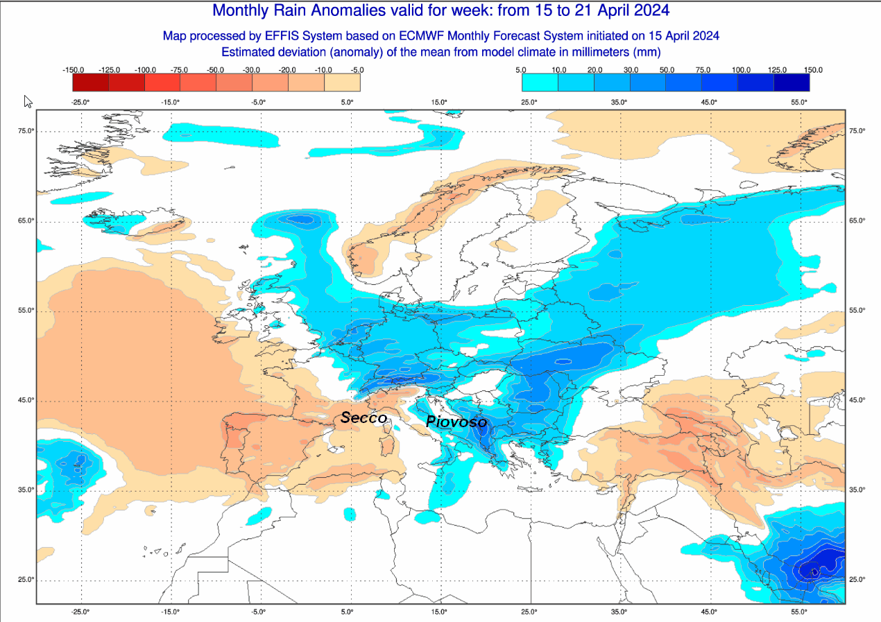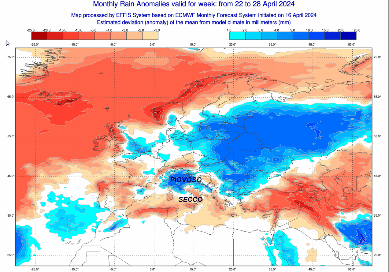 Molto interessante anche il quadro delle ANOMALIE PRECIPITATIVE a scala italica attese per il medesimo lasso di tempo, ovvero tra il 22 e il 28 aprile: