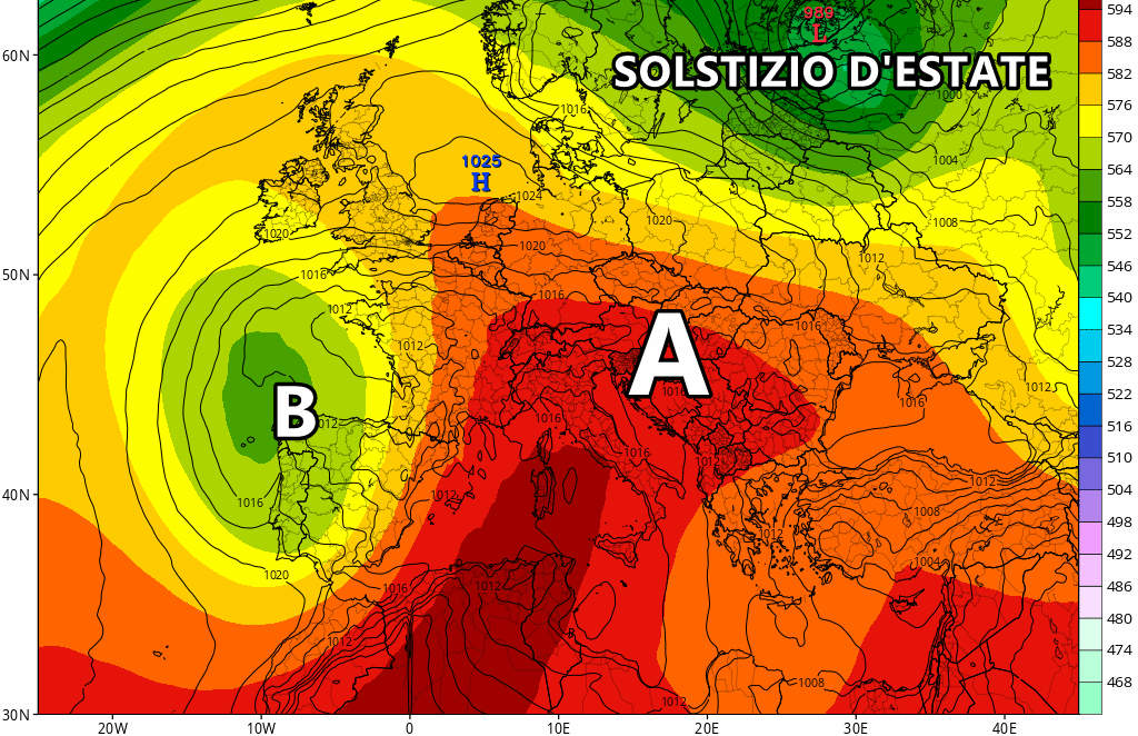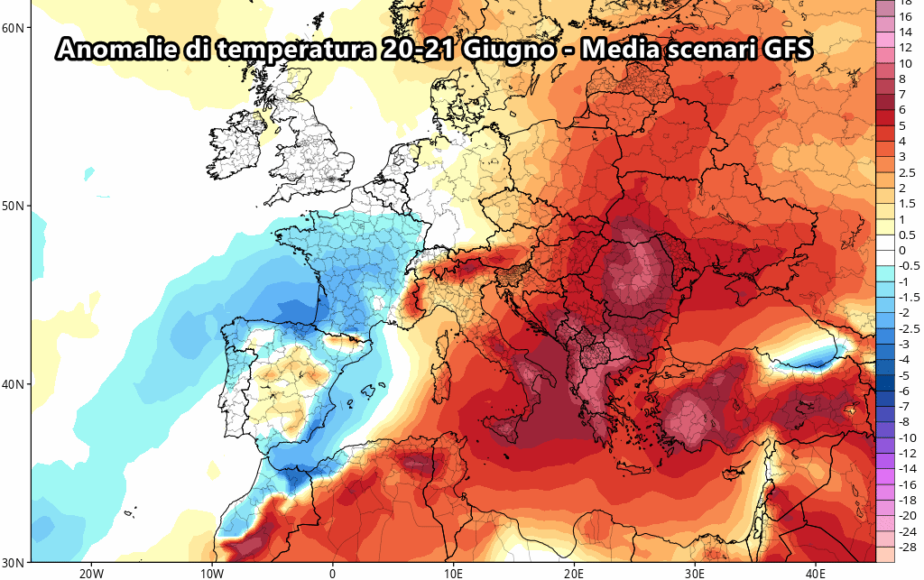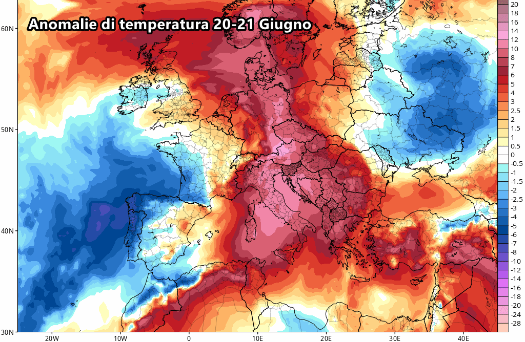 Eloquenti le anomalie di temperatura previste tra il 20 e il 21 giugno, che mostrano una pesante ondata di caldo non solo sull’Italia ma su gran parte dell’Europa centro-meridionale. Da nord a sud la colonnina di mercurio potrebbe salire di ben oltre 10 ° rispetto alle medie tipiche del periodo, che corrisponderebbero a temperature oltre i 35-37 ° su tante nostre città.