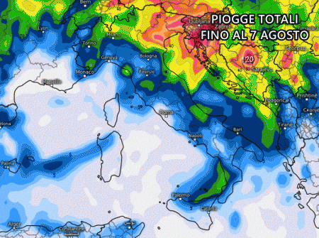 Insomma è chiaro che in questa prima settimana di Agosto saranno regioni come Friuli Venezia Giulia, Veneto e Trentino alto Adige quelle più colpite da piogge e temporali. Le precipitazioni totali previste fino al 7 Agosto confermano questa tesi: