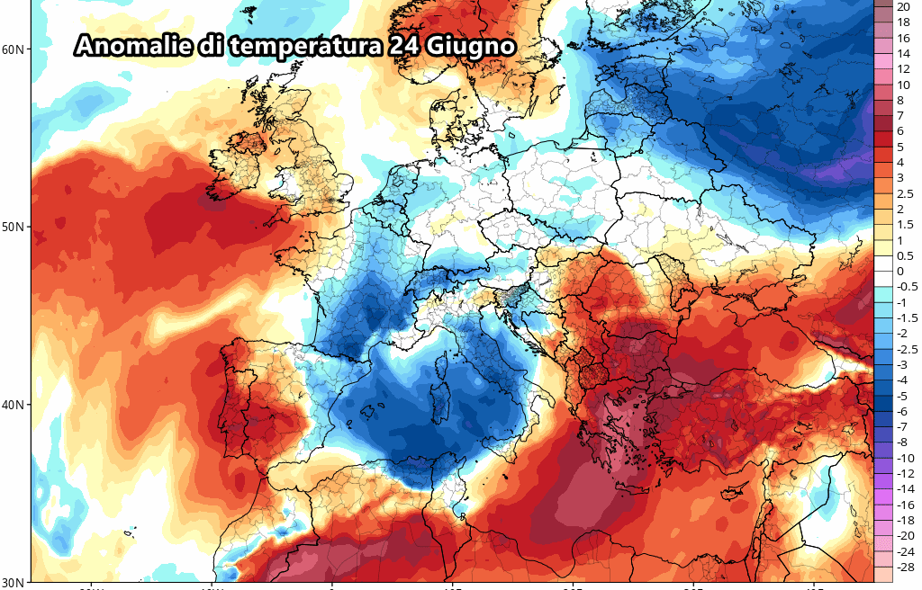 Eloquenti le anomalie previste il 24 Giugno, ad inizio prossima settimana. Dopo diversi giorni di forti anomalie calde, ecco che riappare l’azzurro, segno che la temperatura rischia di scendere addirittura sotto le medie, perdendo di conseguenza oltre 10°C nell’arco di poche ore.
