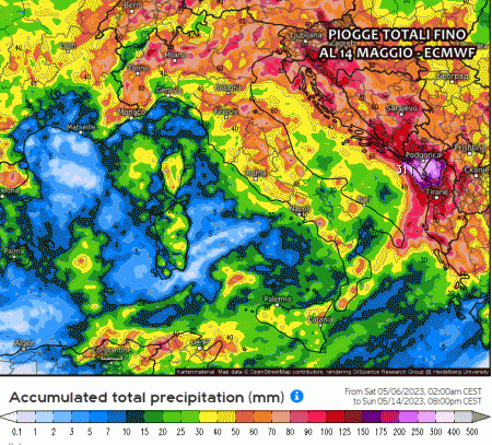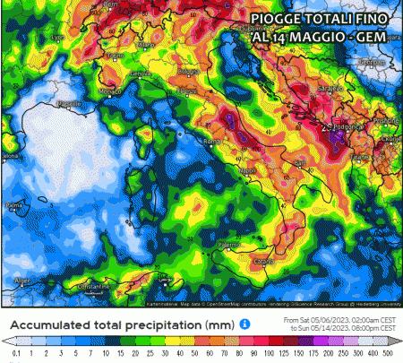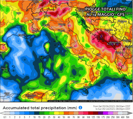 Queste sono le piogge previste fino al 14 Maggio dal modello americano GFS. Al nord, specie su Lombardia e Trentino, si intravedono gli accumuli più abbondanti, anche superiori ai 100 mm.