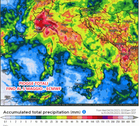 Eloquenti le precipitazioni totali previste dal centro europeo ECMWF ed anche da quello americano GFS. Entrambi mostrano accumuli di pioggia importanti soprattutto sulle regioni del nord, concentrate principalmente tra i giorni di domenica 30 Aprile e lunedì 1° Maggio. Il modello europeo indica accumuli di pioggia totali superiori ai 100-120 mm sul Nordovest, segno di piogge persistenti e anche intense.