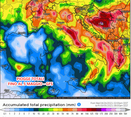 Molto simile l’americano GFS, che propone accumuli totali (fino al 5 maggio) sostanzioni anche per il medio Adriatico e il sud, oltre che per il Nordovest. Insomma davanti a noi è presente, ormai con buona probabilità, un periodo nettamente più piovoso per gran parte d’Italia.