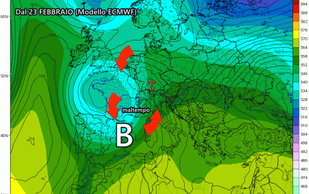La fase di maltempo è altamente probabile a partire dal 23 febbraio e verrebbe innescata da una saccatura fredda artica in discesa dapprima sull’Europa centrale e successivamente sul Mediterraneo. Il suo arrivo sembra scontato, ma la traiettoria che la saccatura assumerà sarà determinante per capire quali regioni verranno colpite da piogge e nevicate.