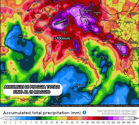 Sono davvero notevoli gli accumuli di pioggia previsti nei prossimi dieci giorni, con protagonista indiscusso il Nordest dove si prevedono punte di oltre 250 mm di pioggia totali.