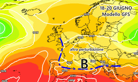 Ma non finisce qui: il modello americano propende per un altro peggioramento appena due giorni dopo. Tra 18 e 20 Giugno si intravede un altro passaggio instabile e fortemente temporalesco su gran parte d’Italia.