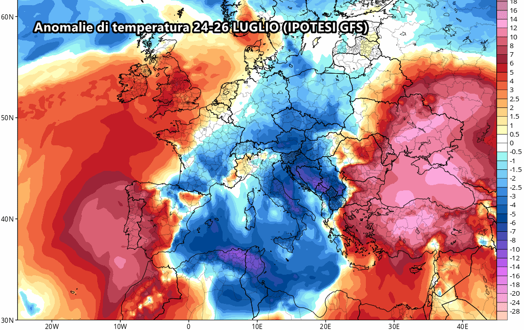 Nel caso in cui questa ipotesi venisse confermata, il calo delle temperature potrebbe risultare davvero estremo, anche di oltre 15-20°C rispetto ai giorni precedenti. La mappa delle anomalie, infatti, mostra temperature molto inferiori alle medie del periodo tra 24 e 26 Luglio.