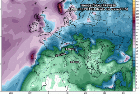 Escludendo qualche piovasco tra 28 e 31 dicembre, discusso in questo articolo, sarà la stabilità a primeggiare su tutto lo Stivale. Insomma non ci saranno piogge o nevicate, ma solo cieli sereni o le solite nebbie/nubi basse. Gli accumuli previsti da oggi fino all’Epifania sono davvero bassi: solo su Liguria orientale e alta Toscana si intravedono picchi di 30-40 mm, per il resto si viaggia tra 0 e 10 mm, ovvero precipitazioni quasi del tutto inesistenti.