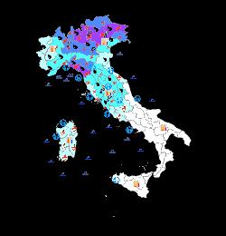 Lombardia: Bassa pianura occidentale, Media-bassa Valtellina, Lario e Prealpi occidentali, Orobie bergamasche, Valcamonica, Laghi e Prealpi Varesine, Alta Valtellina, Valchiavenna, Laghi e Prealpi orientali, Nodo idraulico di Milano, Pianura centrale, Alta pianura orientale, Bassa pianura orientale, Appennino pavese