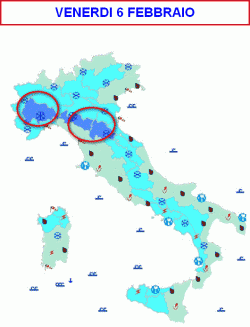 Previste precipitazioni diffuse, a prevalente carattere nevoso fino in pianura, su Piemonte centro-meridionale ed occidentale, Lombardia centro-meridionale, Trentino, Alpi venete, Emilia Romagna, Toscana settentrionale ed entroterra ligure, con quantitativi cumulati da moderati ad abbondanti specie sui settori occidentali e sull’Emilia-Romagna.