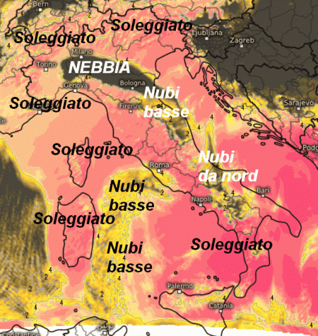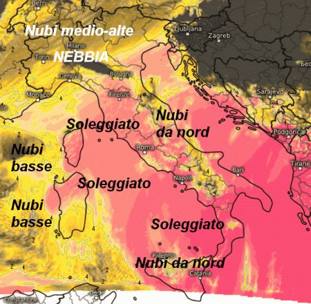 A godere di un ottimo soleggiamento saranno le aree colorate in fucsia, ovvero gran parte del centro ad eccezione del versante adriatico e parte della Sardegna, oltre al meridione ad eccezione della Sicilia settentrionale, il Molise e la Lucania che avranno nubi da nord. Un buon soleggiamento sarà presente anche in Liguria e sulle Venezie, mentre i settori alpini e le alte pianure saranno interessate da nubi medio-alte.
