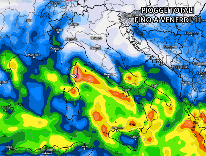 Difatti analizzando la mappa delle piogge totali previste fino a venerdì, notiamo chiaramente una maggior concentrazione di precipitazioni sulle regioni meridionali. Al nord, a cui aggiungiamo anche Toscana e Umbria, pioverà davvero molto poco e per lunghi tratti non cadrà nemmeno una goccia d’acqua.