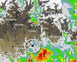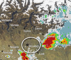 Il radar di lunedì 5 settembre: si notano ben due cellule temporalesche in seno a correnti da NW, Milano rimane completamente saltata.
