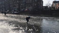 Canali di Amsterdam congelati. La gente ne approfitta per pattinarci sopra!