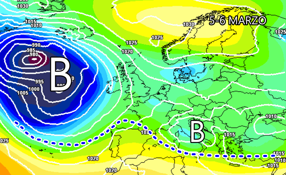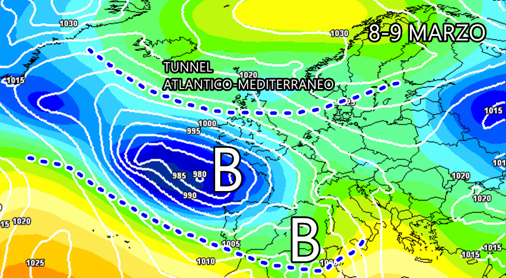 Qualche incertezza in più riguardo l’arrivo di un’altra perturbazione nel prossimo week-end, tra 8 e 9 marzo, ma i principali centri di calcolo mostrano la possibilità di un nuovo peggioramento a causa di un altro fronte da ovest. Il tunnel che collegherà Atlantico e Mediterraneo potrebbe favorire ondate di maltempo a catena anche nel prosieguo del mese.