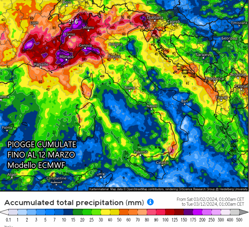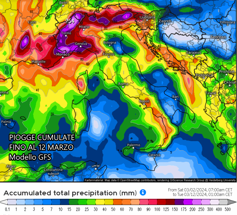 Passando alle piogge previste nei prossimi 10 giorni, notiamo un’elevata concentrazione di piogge sul Nordovest. Secondo il modello europeo ECMWF potrebbero scendere oltre 200-250 mm di pioggia tra Liguria, Piemonte e Valle d’Aosta, alimentando il rischio di fenomeni intensi e disagi. Piogge anche sul Triveneto e sul resto d’Italia, seppur con accumuli totali inferiori.
