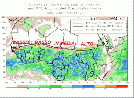 Una maggior estroflessione dell’ITCZ verso nord facilita le rimonte dell’alta pressione africana verso il Bacino del Mediterraneo e l’Italia. Di conseguenza, in estate, questo parametro diventa fondamentale per la previsione di una possibile risalita del famigerato "Gobbo". La mappa in alto ce lo mostra…così come è disposto in questi ultimi giorni, o meglio come era disposto nella SECONDA DECADE DI MAGGIO. La linea scura rappresenta la sua altezza media, mentre la linea rossa la posizione assunta dal 10 al 20 maggio, mentre la linea gialla la vecchia posizione assunta nella prima decade di maggio (dal 1 al 10 maggio).