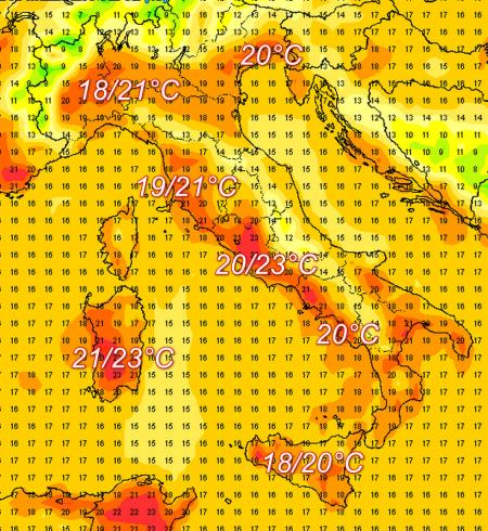 ANALISI E TENDENZA. Un campo di alta pressione protegge l’Italia da nuovi attacchi perturbati. La fase di instabilità che c’è interessato nei giorni Scotti passa quindi il posto ad una fase di tempo più soleggiato contraddistinto da temperature in rialzo. Quest’oggi i venti da nord-est hanno determinato un rialzo della temperatura particolarmente sensibile lungo i versanti tirrenici, con picchi anche fino a 25 gradi. Nella giornata di domani avremo ancora valori tardo primaverili soprattutto nelle aree pianeggianti interne, con picchi fino a 23-25°C. Stima dei valori massimi previsti dal modello americano per il pomeriggio di venerdì 29 aprile: