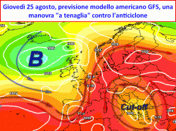 Tra giovedì 25 e venerdì 26, il modello americano abbozza addirittura quella che potremo definire come "manovra a tenaglia". Il nostro anticiclone sarà infatti "stretto" nella morsa tra due circolazioni di bassa pressione; la prima già citata, in azione sui Balcani e sui settori centro-orientali del Mediterraneo, la seconda arroccata sulla Penisola Iberica.