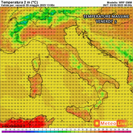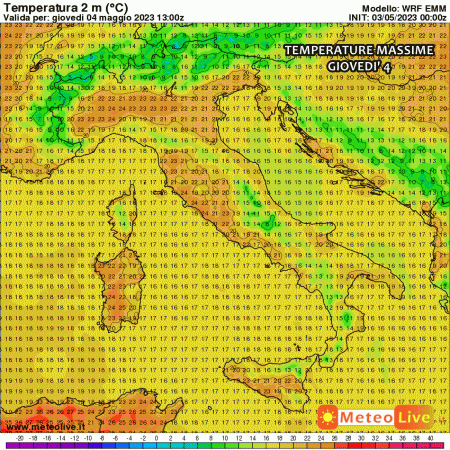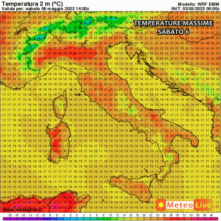 Sabato i tepori sub-tropicali cominceranno a fare sul serio. Si notano punte di 27-28°C in Val Padana, specie Emilia, Lombardia, basso Piemonte. Situazione analoga in Sardegna. Fino a 23-25°C altrove.