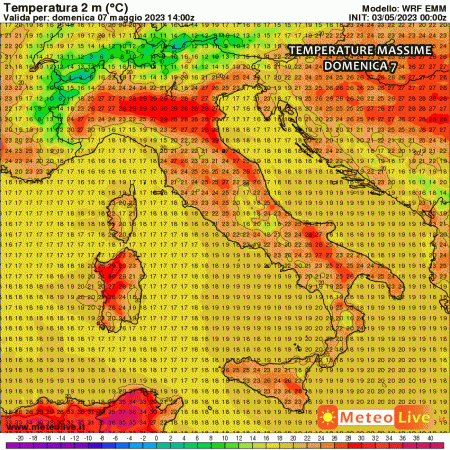 Domenica potrebbe rivelarsi la giornata più calda della settimana. Addirittura possiamo scorgere i primi picchi di 29-30°C al nord e Sardegna. Clima molto mite altrove con punte di 27-28°C.