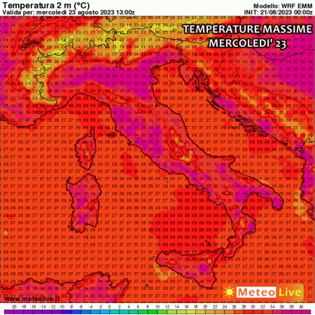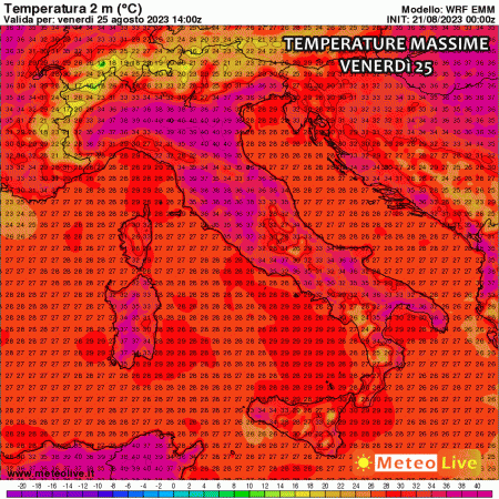 Ma dove farà più caldo? Senza dubbio, le temperature più alte le registreremo nei settori interni del centro e del Nord, quindi in Val Padana e nelle aree interne di Toscana, Umbria e Lazio. Tra martedì e sabato, le temperature saliranno ulteriormente, raggiungendo i 39-40 °C in molte località dei settori interni. Non escludiamo punte di 41-42 °C in Emilia, Toscana e Lazio.