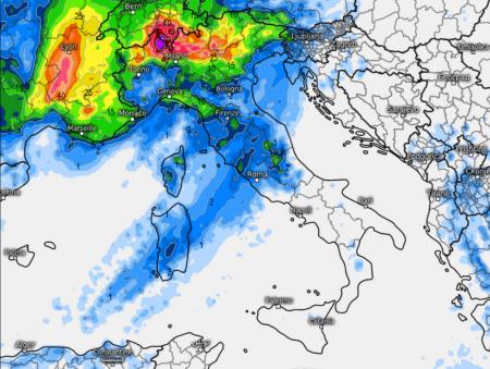 Tale situazione porterà allo sviluppo di una nuova perturbazione prevista raggiungere le regioni italiane settentrionali nella giornata di venerdì 26 aprile. In questa sede sono previste delle nuove piogge soprattutto al nord. Ecco la previsione della pioggia calcolata dal modello europeo: