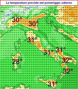 CALDO: si impadronirà dell’insieme del Paese ma al sud sarà soffocato dai temporali, mentre al nord e al centro insisterà almeno sino a venerdì ed attenuato anche nel fine settimana. Si potranno raggiungere picchi di 33-34°C, soprattutto sul catino padano, la Toscana, i fondovalle alpini, l’Umbria, le Marche, la Sardegna ed il Salento.