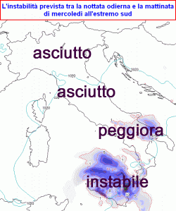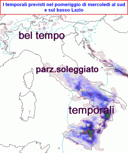 GOCCIA FREDDA: influenzerà dalla notte il tempo della Sicilia e del sud Calabria, nel corso di mercoledì determinerà temporali sparsi anche sul resto del sud, sul basso Lazio e sul basso Abruzzo. Anche giovedì e venerdì l’instabilità si rinnoverà sulle medesime zone, coinvolgendo marginalmente anche l’arco alpino, dove si registreranno soprattutto a causa dell’elevato riscaldamento diurno.