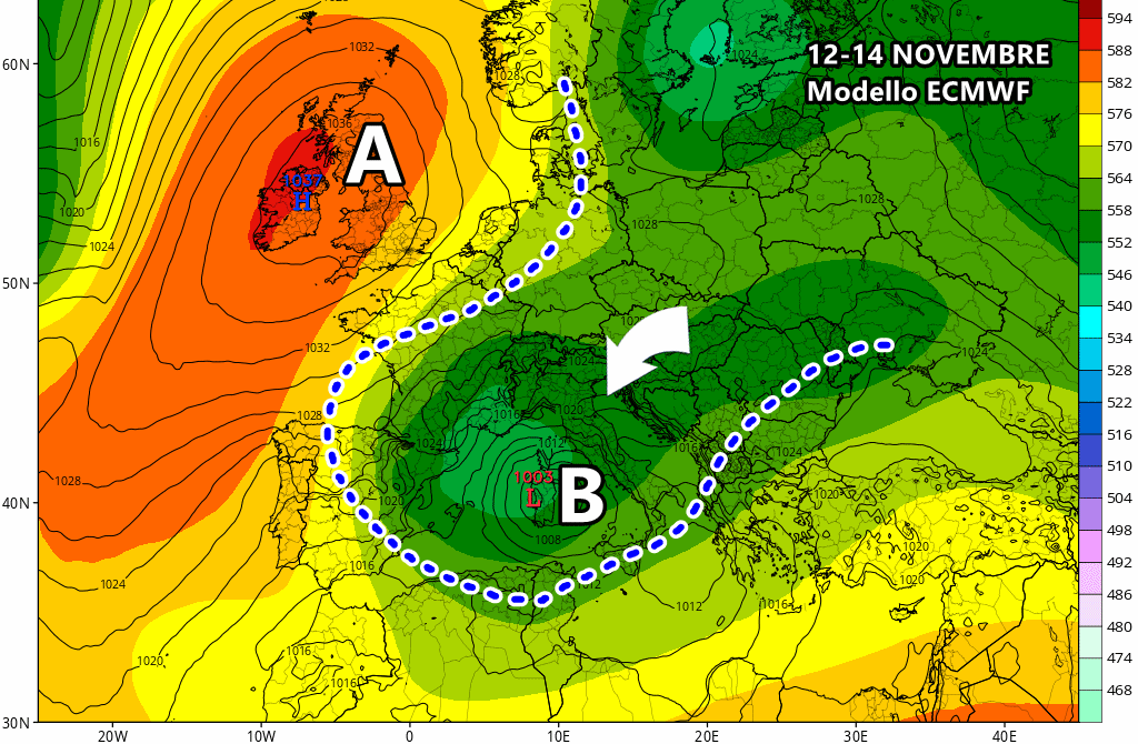 La stabilità sarà presto minata da nuove perturbazioni, ma con una grande differenza rispetto al mese d’Ottobre! L’Autunno tornerà in auge con una circolazione prettamente orientale, una situazione che inevitabilmente ci traghetterà nella tarda stagione o addirittura in Inverno, soprattutto sotto l’aspetto termico. Tornerà anche la pioggia, ormai con alta probabilità, come visto qui.