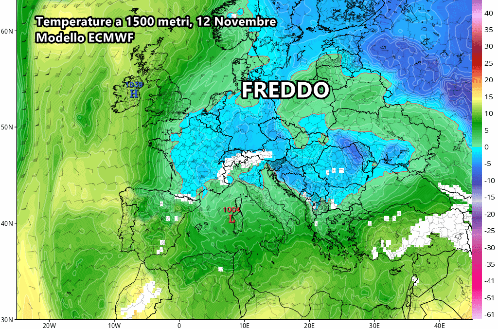Il calo termico sarebbe comunque considerevole! L’isoterma 0 a 850hpa (circa 1500 metri) avvolgerebbe il nord Italia, traghettandoci in un’atmosfera pienamente invernale. Le nevicate in alta quota, lungo l’Appennino, sarebbero senz’altro garantite con una dinamica come quella mostra al momento.