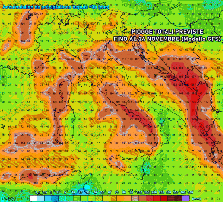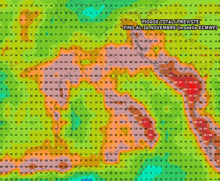 Gli accumuli totali previsti dai modelli matematici, fino al 24 novembre, sono decisamente importanti specie sui settori esposti come quelli tirrenici. Al momento evidenziamo picchi potenzialmente eccezionali sul basso Tirreno (anche oltre 400 mm totali nei prossimi 10 giorni), previsti dal modello ECMWF: