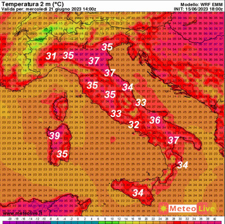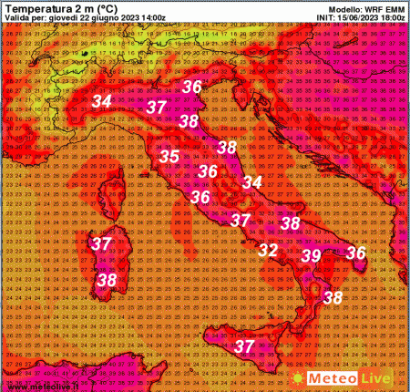 Punte di 39° sulla bassa Lucania, 38° tra la Romagna, le Marche, in Sardegna e sulla Calabria Ionica, 37° in Sicilia e sul basso Lazio. Si salveranno probabilmente solo le coste stante la brezza di mare.