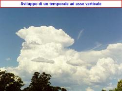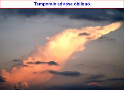 Ecco che allora la nube assume una forma più curiosa, simile ad una torre in procinto di cadere, ossia si genera una “nube cumuliforme ad asse obliquo”. Come si può immaginare in tal caso il flusso di aria calda che sale verso l’alto all’interno del cumulo non tende a contrastare con i rovesci e quindi si ha una nube molto più longeva e quindi un eventuale acquazzone o temporale molto più intenso, in grado di arrecare DANNI anche gravi.