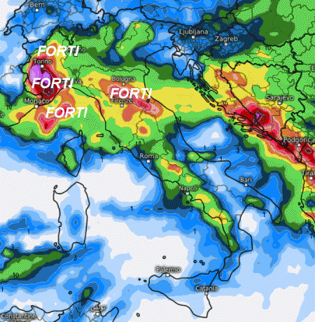 Precipitazioni intense al nord-ovest e sull’Emilia Romagna, con tanta neve in montagna; le piogge guadagnerebbero terreno anche su parte del centro, mentre dal Lazio verso sud dominerebbero le correnti miti da sud-ovest con piogge solo sul Tirreno, ma in un contesto mite.