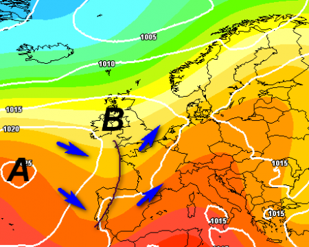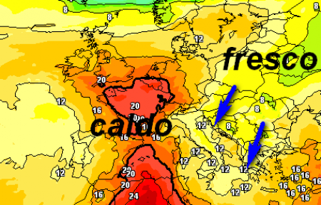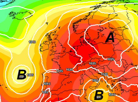 L’anticiclone si erge a baluardo del bel tempo e invia una massa d’aria molto calda in direzione della Francia. Lungo il suo bordo orientale sta invece per affluire aria decisamente meno calda, che raggiungerà l’Italia a partire da lunedì 4 settembre, come vediamo da quest’analisi termica a 1500m: