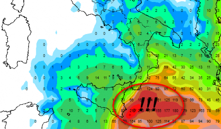 Guardate la carta barica prevista per mercoledì 6 settembre e poi gli accumuli di pioggia sino a venerdì 8 settembre, dai quali si evince che la situazione sull’area jonica risulta particolarmente delicata, con accumuli previsti in mare aperto sino a 220mm, ma con l’effetto stau di questo tipo di correnti che potrebbe favorire accumuli simili anche sulla terraferma, specie nel SIRACUSANO: