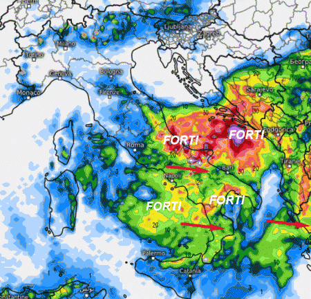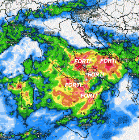 Temporali e rovesci forti su Abruzzo, basso Lazio e su quasi tutto il meridione ad eccezione delle zone più estreme. In questi settori sono da attendersi nubifragi o alluvioni lampo. Temporali intensi anche sull’ovest della Sardegna, più sparsi ed isolati al nord e sulla Toscana.