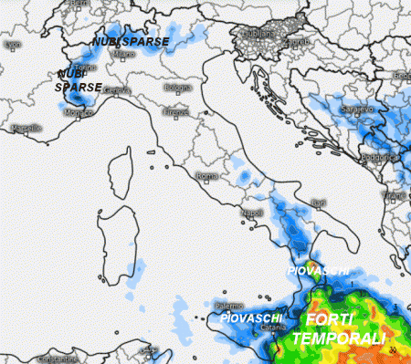 Ecco la struttura temporalesca sullo Ionio che potrebbe lambire la Calabria Ionica e la Sicilia orientale con qualche fenomeno. Qualche piovasco non si esclude anche sulla Lucania. Al nord avremo annuvolamenti in corrispondenza della fascia prealpina centro-occidentale, ma non si prevedono precipitazioni, per il resto gran sole.