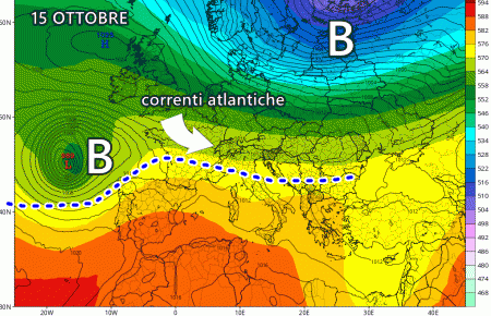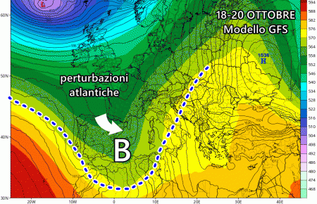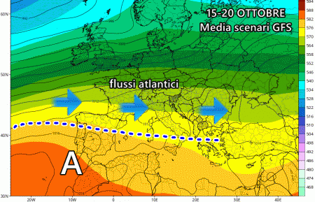 Anche la media degli scenari del modello americano GFS concorda con un abbassamento dei flussi atlantici anche sull’Europa meridionale e sul Mediterraneo, dove tra il 15 e il 20 ottobre potrebbero inserirsi una serie di perturbazioni. L’anticiclone tenderà pian piano a rintanarsi sul Nordafrica e nell’Atlantico centrale: