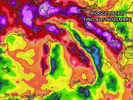 La mappa delle precipitazioni totali fino al 5 novembre, che tiene conto di tutte le perturbazioni appena mostrate, ci rivela una situazione che manca da tempo. Troviamo accumuli davvero sostanziosi e diffusi su gran parte dello Stivale, ma spiccano i settori alpini e tirrenici dove potrebbero precipitare oltre 400 mm di pioggia totali.