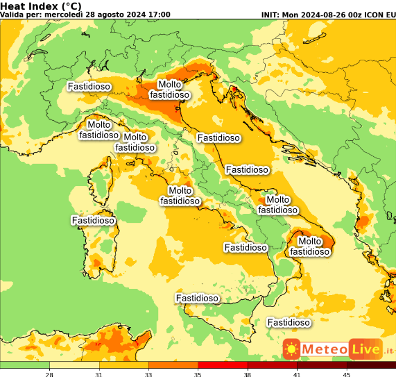 Questo invece è il DISAGIO da CALDO atteso in Italia alle ore 16 di mercoledi 28 agosto:
