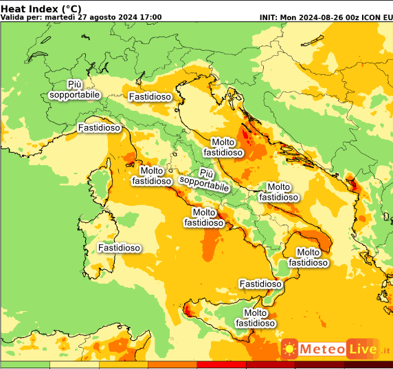 A parte le zone interne dell’Italia centro-meridionale, oltre alla fascia interna della Sicilia e della Calabria che avranno un caldo maggiormente sopportabile, su tutte le altre regioni il caldo sarà ancora FASTIDIOSO o MOLTO FASTIDIOSO dove vedete il colore più acceso sulle mappe.