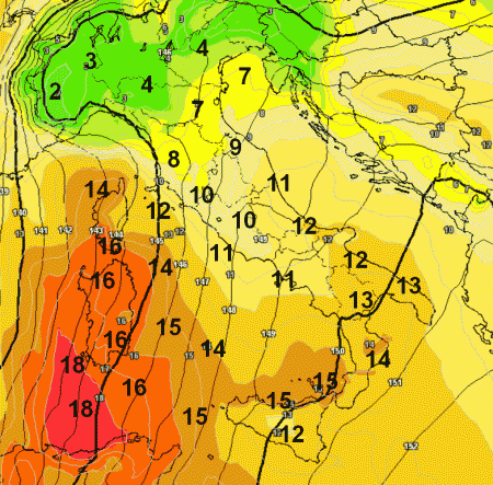 A sud ovest della Sardegna comparirà alla medesima quota l’isoterma + 18°, un valore da inizio estate! Sulla verticale della Sardegna avremo 16° a 1500 metri, 15° sul nord della Sicilia, tra 10 e 13° su quasi tutto il centro-sud. Più fresche le temperature al nord-ovest dove interverranno le prime piogge.