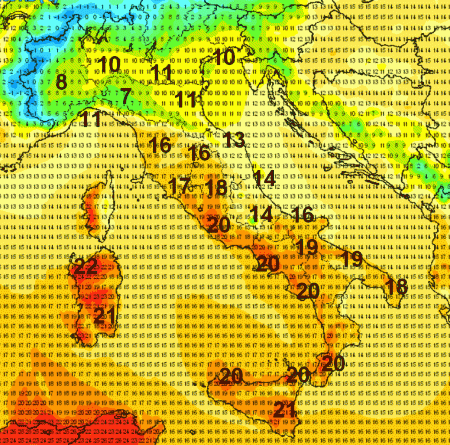 Vallori attorno a 20° (o di poco superiori) saranno possibili sulle due Isole Maggiori e sul medio-basso Tirreno. Notevoli anche i 18° nelle aree interne dell’Italia centrale e i 19° sulla Puglia.