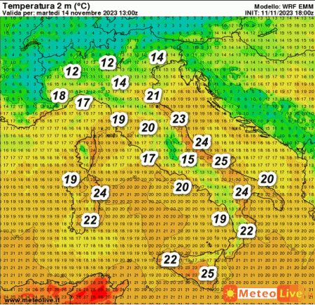 La seconda mappa mostra le temperature al suolo attese in Italia alle ore 14 di martedi 14 novembre: