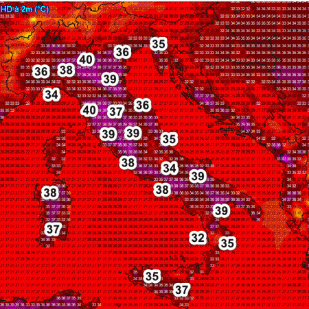 Ecco i 40° che si dovrebbero toccare sull’Emilia Romagna e sulla Toscana. Molte regioni faranno registrare temperature attorno a 38-39°. Come vedete, il caldo si estenderà anche al sud e sul medio versante adriatico.